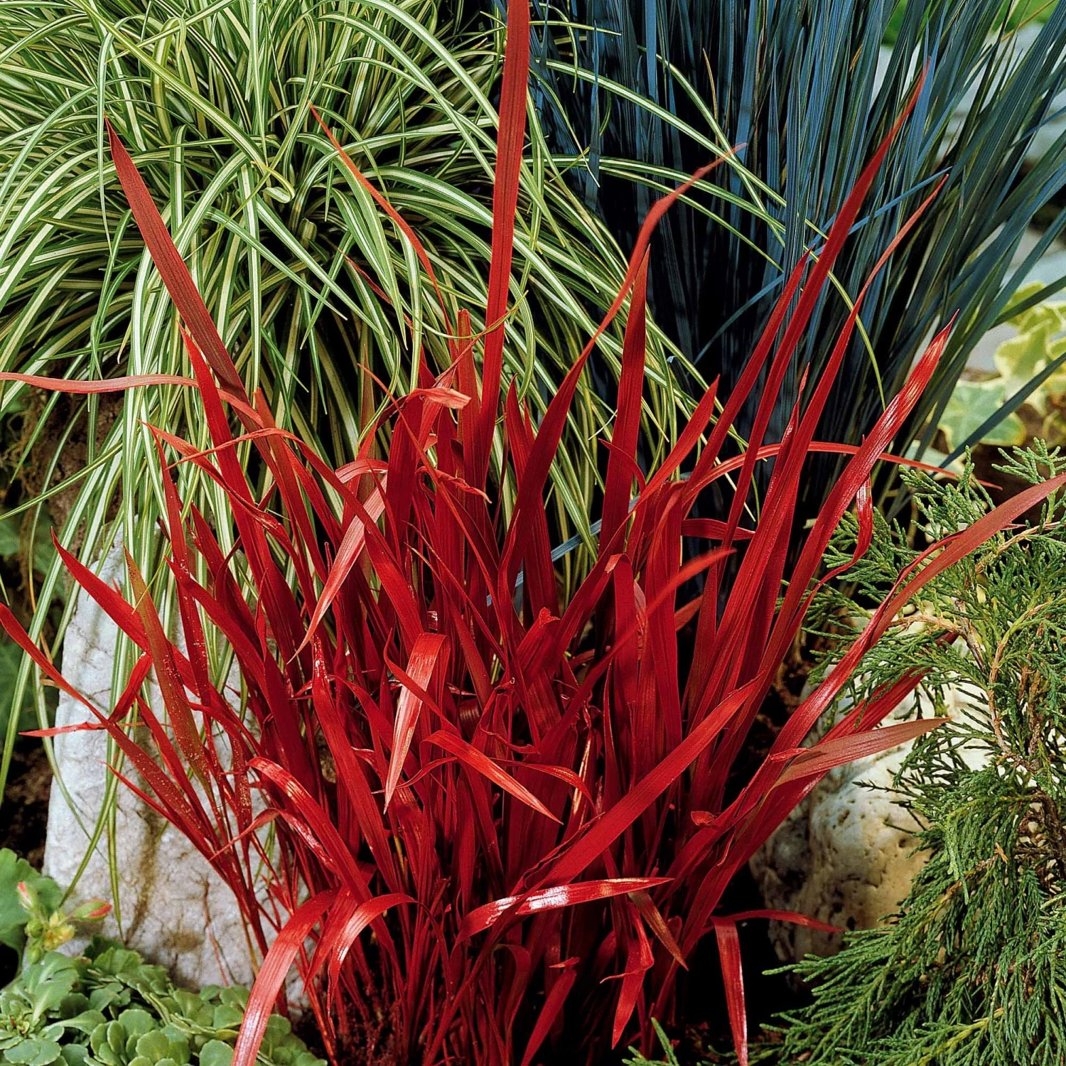 L’Imperata ‘Red Baron’ est comme une star sur la scène de votre jardin, mais elle joue bien avec d’autres. Son rouge profond crée un contraste visuel époustouflant avec des plantes aux feuilles argentées ou bleu-vert. Pensez à l’Euphorbia, aux graminées comme la fétuque bleue, ou même aux lavandes.